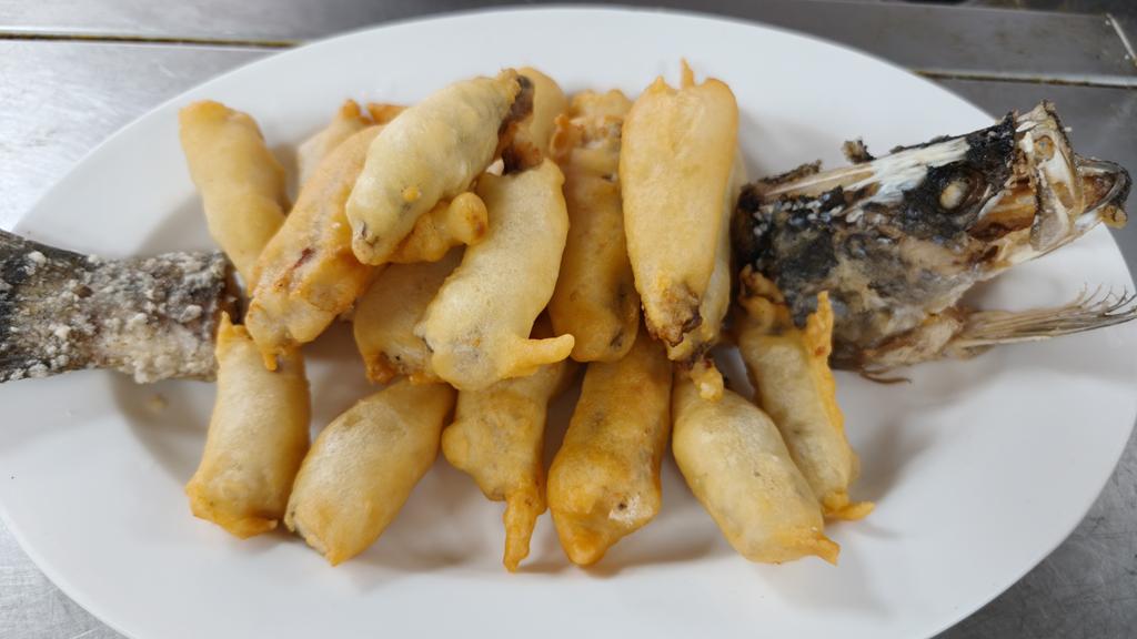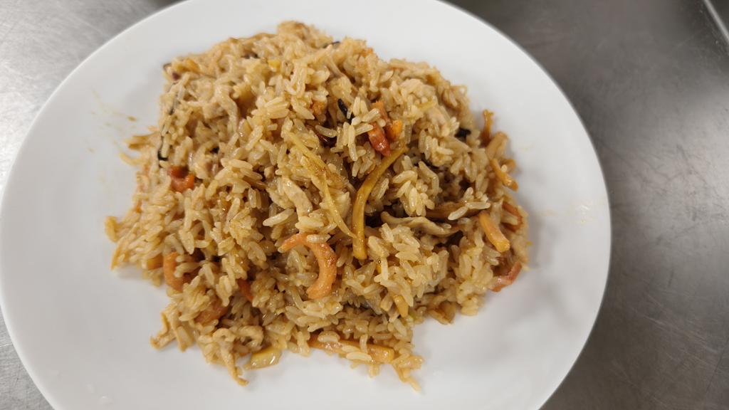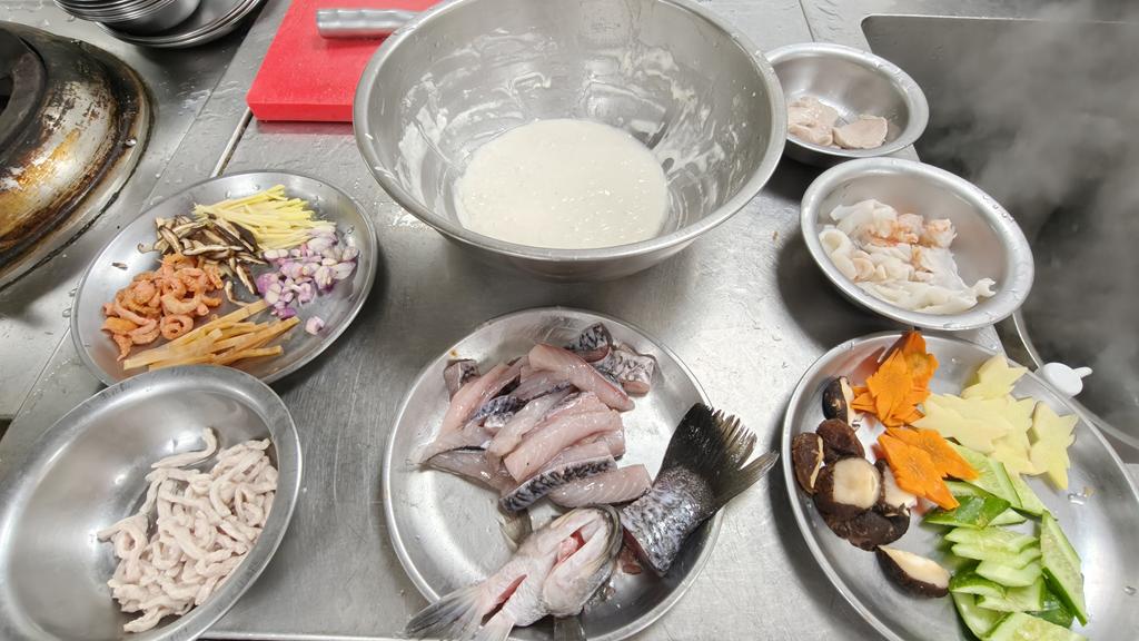 單元301-5香菇肉絲油飯,炸鮮魚條,燴三鮮