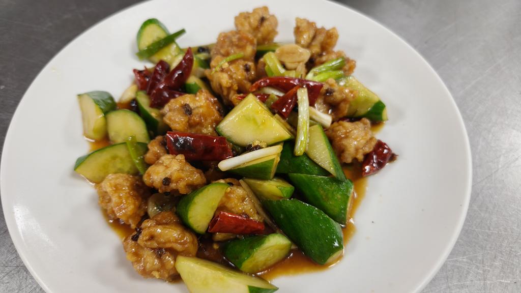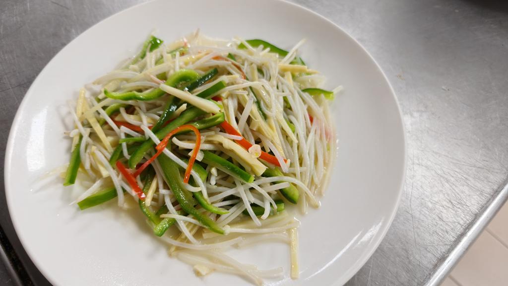 單元301-8脆溜麻辣雞球,銀芽炒雙絲,素燴三色杏鮑菇