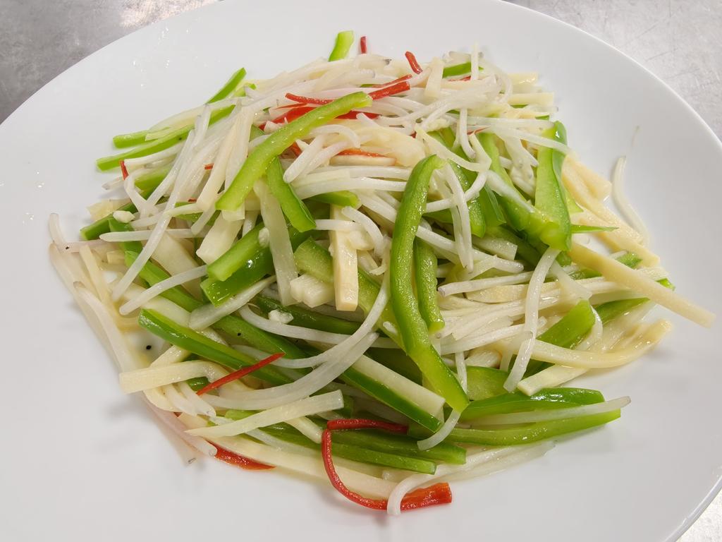 單元301-8脆溜麻辣雞球,銀芽炒雙絲,素燴三色杏鮑菇